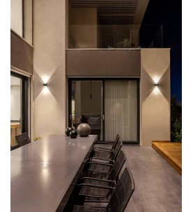 Tendance Domotique vous propose une applique murale pour éclairage extérieur KOS 2 R. Diffuseurs en verre. Eclairage "up&down". Avec entrée et sortie de câble. Convertisseur non dimmable intégré dans l'appareil.
